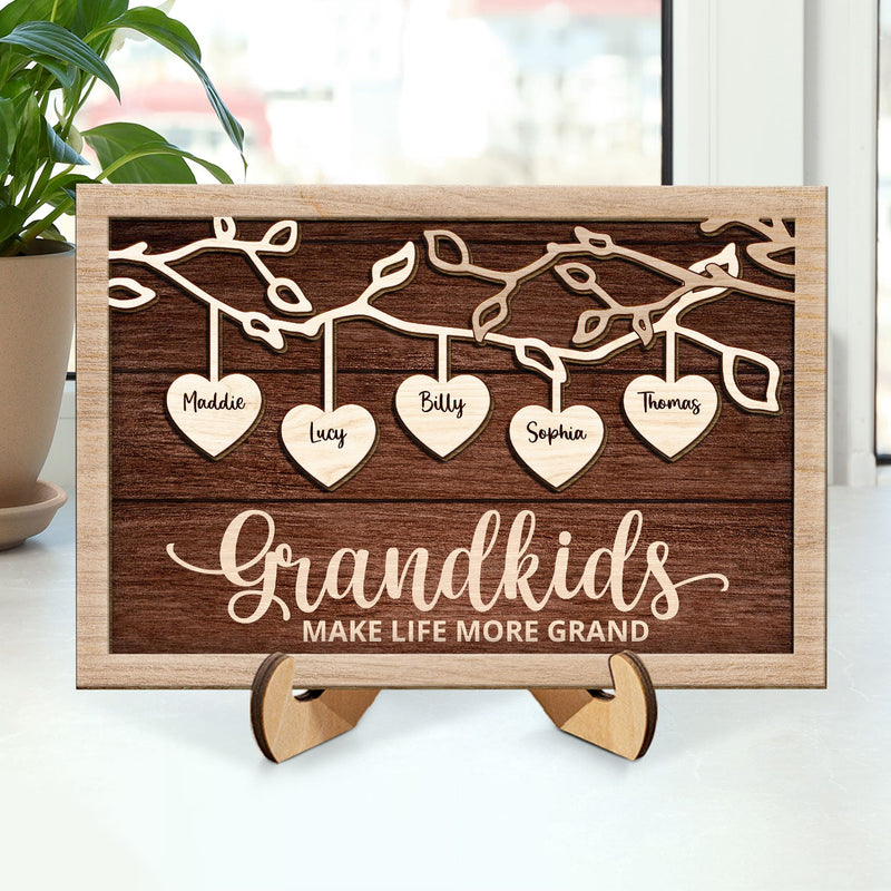 Grandkids Make Life More Grand - Gift For Grandma, Grandpa, Grandparents, Dad, Mom - Personalized 2-Layered Wooden Plaque With Stand