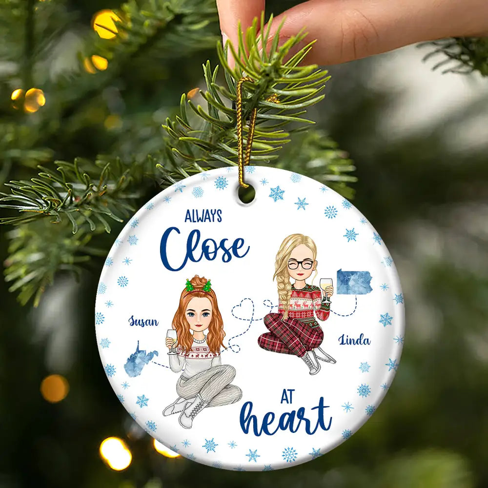 Celebrate your mischievous bond with the Miles Apart But Besties At Heart Long Distance - Personalized Circle Ceramic Ornament – an awesome and joyful gift for besties and sisters! Perfect for Christmas, Birthday, Thanksgiving, Mother's Day, or Friendship Day, it’s a thoughtful gift for bestie or sisters that brings fun and flair to any space.