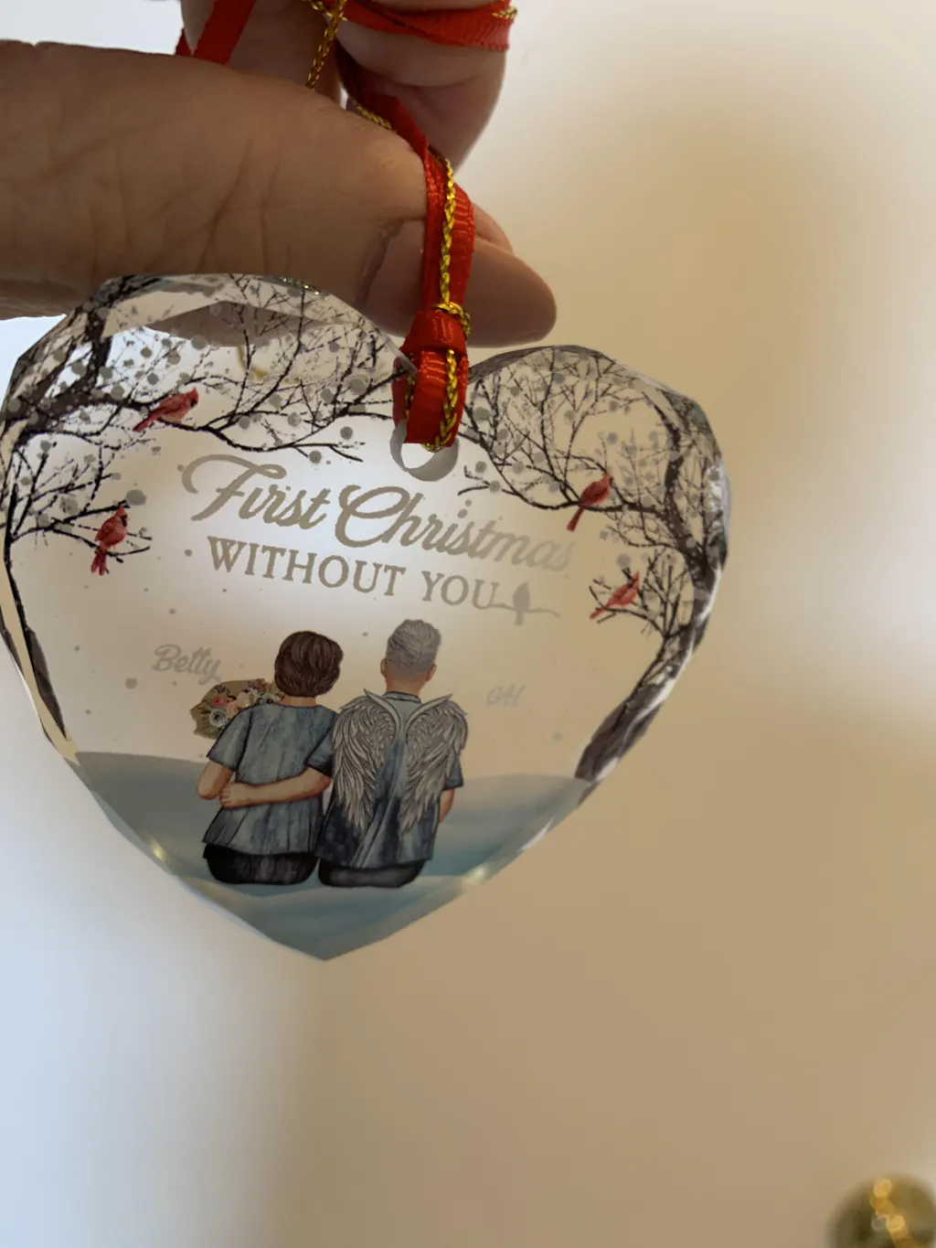 Display this unique heart-shaped glass ornament on your Christmas tree, in a window, or on a mantel to keep the memory of your loved one close. Its personalized design makes it a sentimental and thoughtful keepsake, ideal for those who are experiencing their first Christmas without someone special.