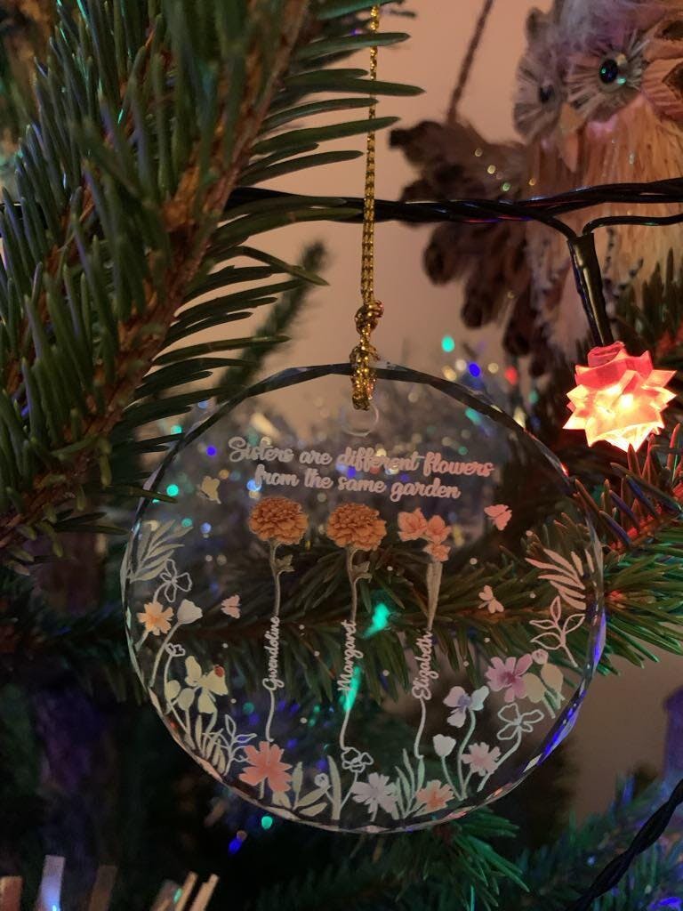 Celebrate your cherished sisterhood with the Birth Flower Sisters From The Same Garden - Personalized Circle Glass Ornament. Meticulously crafted from 100% clear glass with beveled edges, this solid glass ornament exudes timeless elegance, catching and reflecting light beautifully to add a radiant touch to your Christmas tree, wreath, or mantel. The ornament’s beveled edges create a stunning prism effect, giving it a sophisticated, multi-dimensional appearance. The smooth, crystal-clear surface is perfect for customizing.