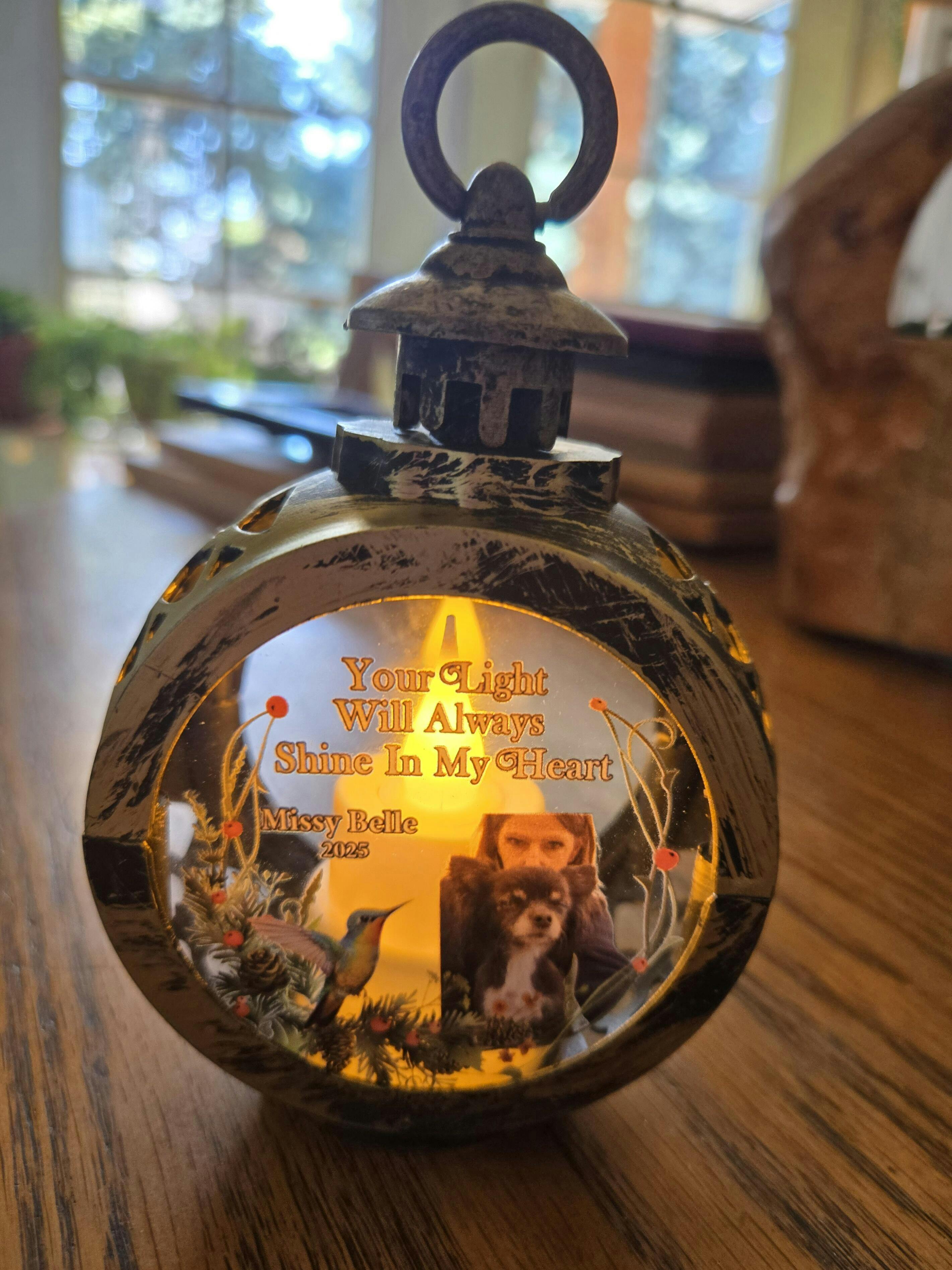 Illuminate your home with this sentimental lantern ornament, which serves as a beautiful tribute to your furry friend. Place it on a shelf, mantle, or bedside table, creating a warm and comforting atmosphere that honors their memory. The custom photo option allows you to personalize it with a cherished image, ensuring it becomes a beloved keepsake.