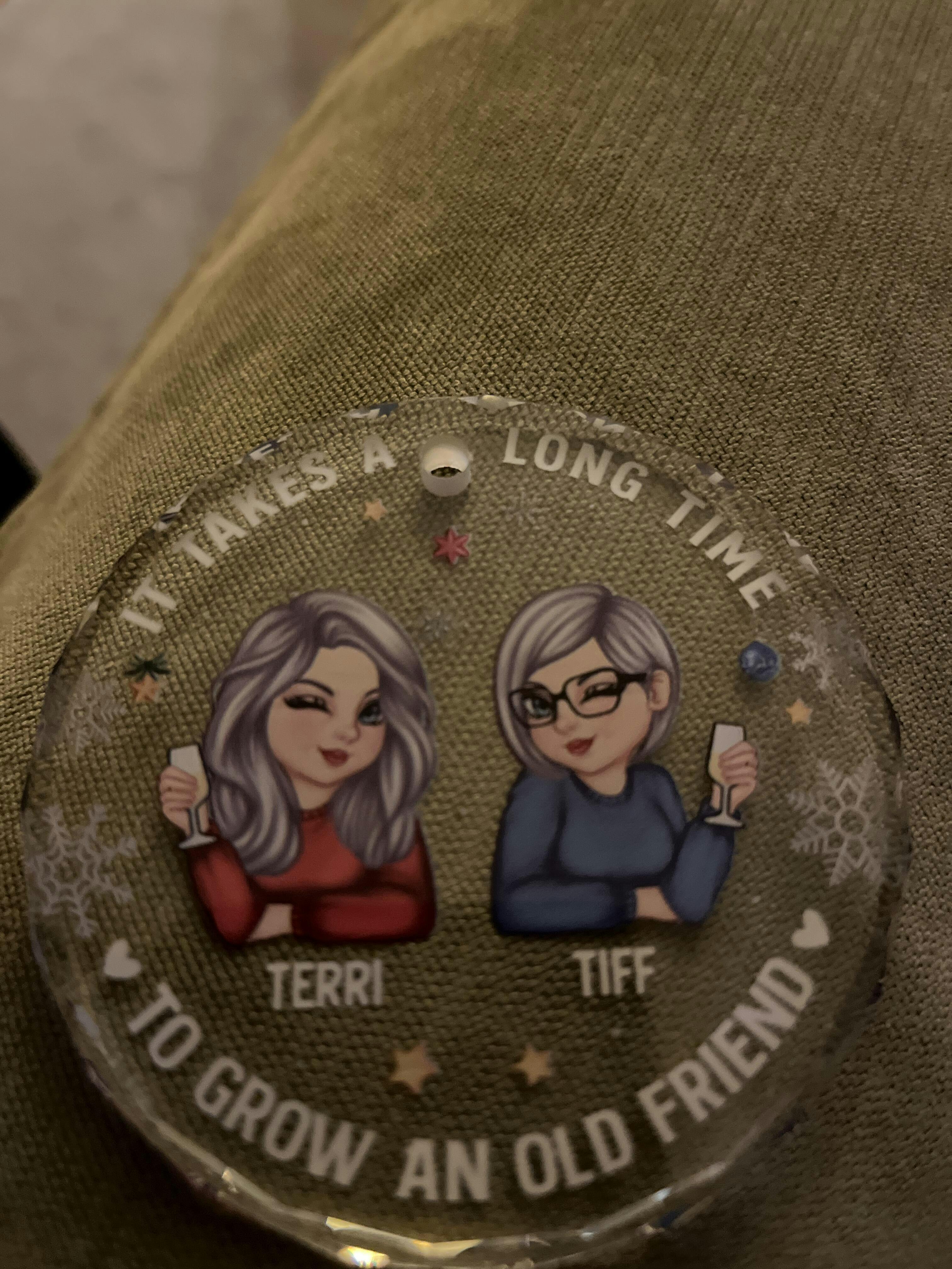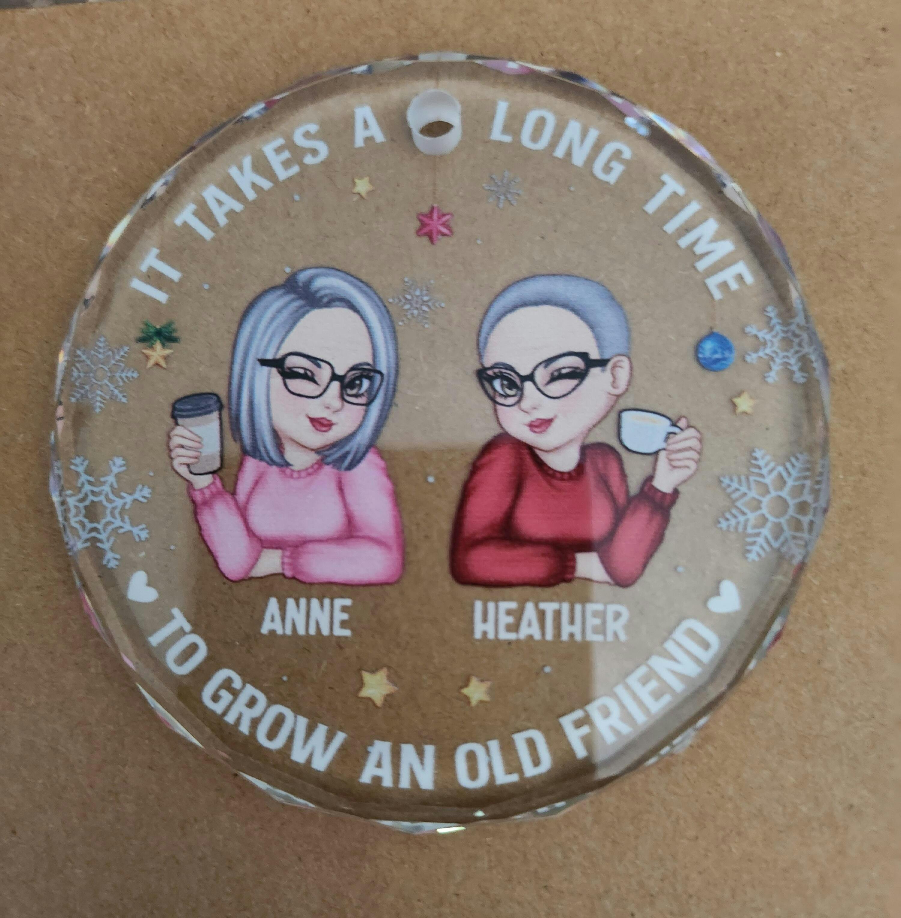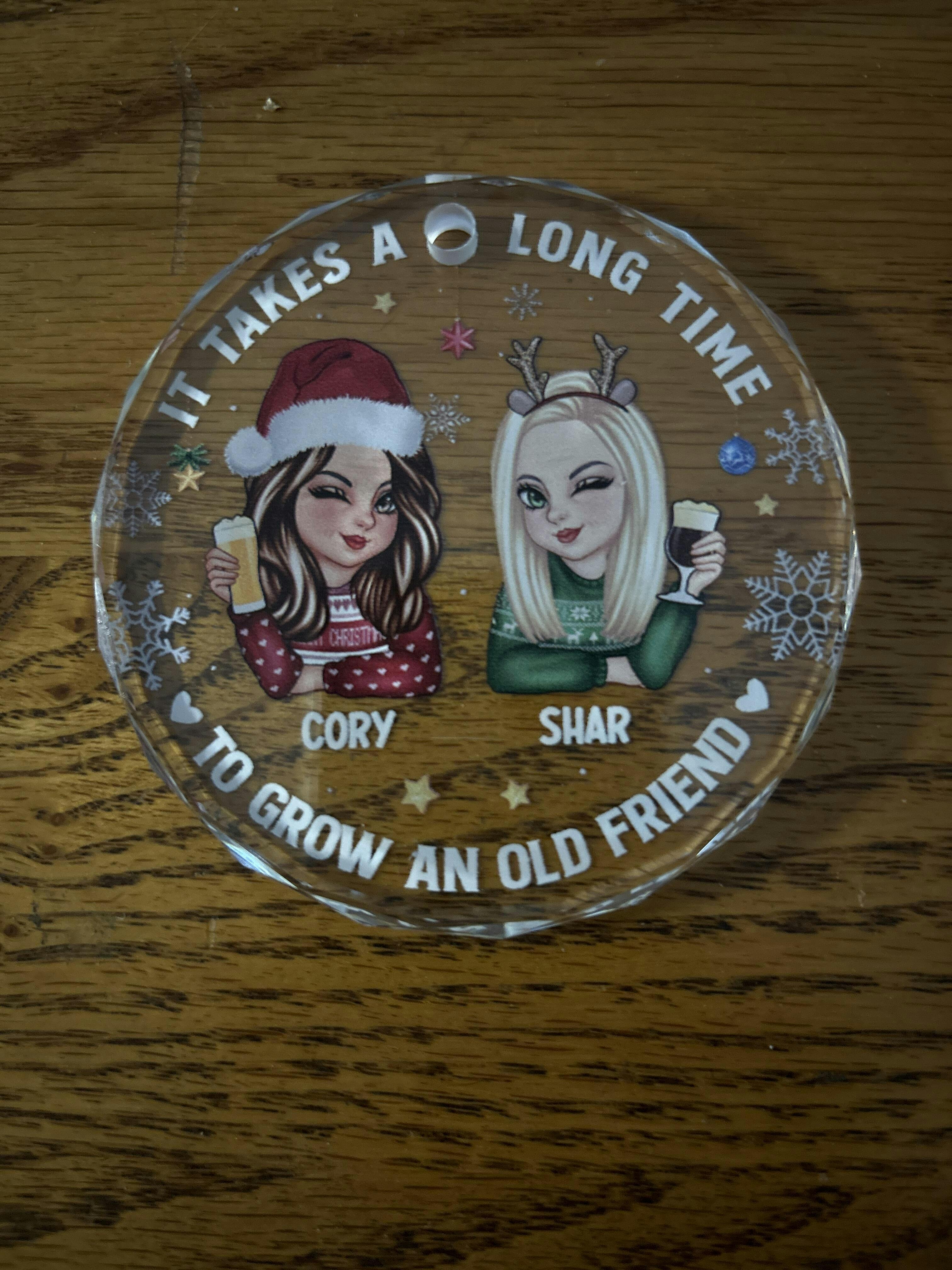 Celebrate the special bond you share with our "It Takes A Long Time To Grow An Old Friend Christmas - Personalized Circle Glass Ornament" meticulously crafted from 100% clear glass with beveled edges. This solid glass ornament exudes timeless elegance, catching and reflecting light beautifully to add a radiant touch to your Christmas tree, wreath, or mantel.