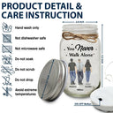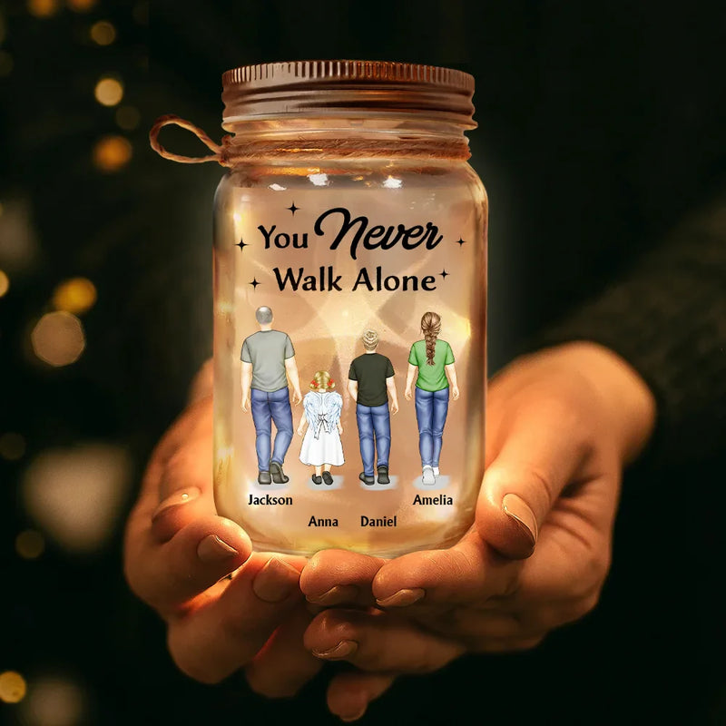 The "You Never Walk Alone" Personalized Mason Jar Light is a unique and heartfelt way to honor the memory of a loved one. Perfect for times of remembrance and bereavement, this meaningful light serves as a comforting symbol that your loved one is always with you, even in their absence. Its soft glow creates a warm, peaceful atmosphere, making it a thoughtful addition to any home. Ideal for mothers, fathers, daughters, sons, grandma, grandma on Mother's Day, Father's Day, Thanksgiving, Christmas, birthday, anniversaries, or just because.