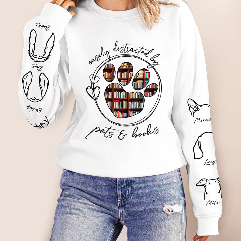 Easily Distracted By Dogs Cats And Books - Birthday, Loving Gift For Dog Lover, Cat Mom, Pet Mum - Personalized Unisex Sweatshirt With Design On Sleeve