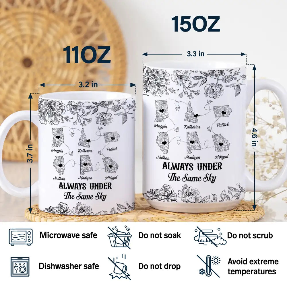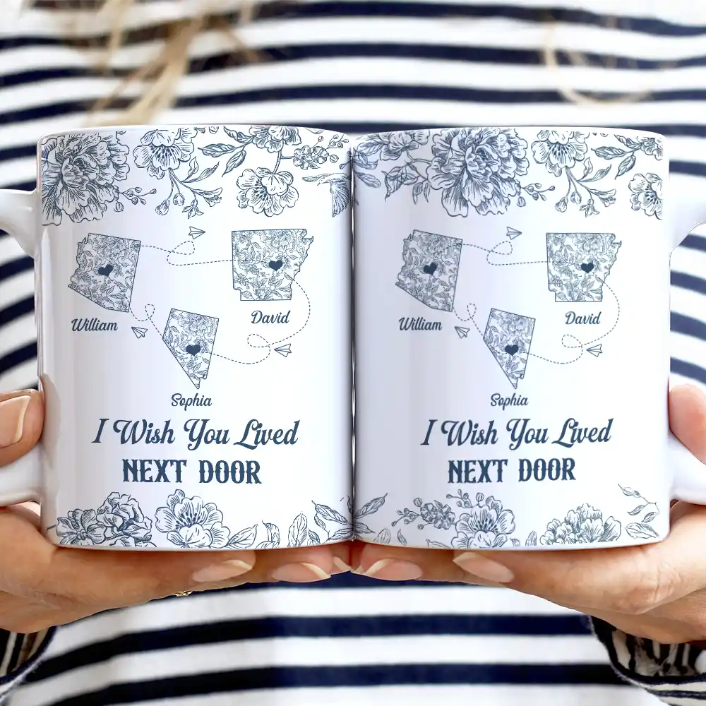 Make distance feel smaller with the Miles Apart But Close At Heart Toile Pattern - Personalized White Edge-to-Edge Mug. A meaningful gift for bestie, gift for sisters, gift for mother, or gift for daughter, this mug is perfect for birthdays, Christmas, Thanksgiving, Mother's Day, Valentine’s Day, or just because. It brings a warm sense of connection, comfort, and love with every sip.