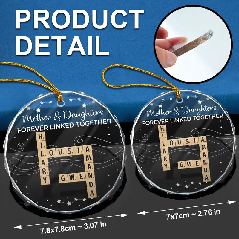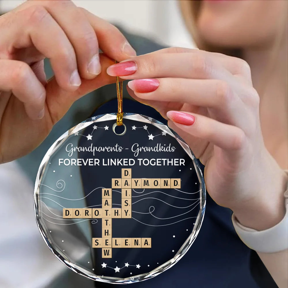 Make your Christmas unforgettable with the Crossword Family Forever Linked Together - Personalized Circle Glass Ornament! Meticulously crafted from 100% clear glass with beveled edges, this solid glass exudes timeless elegance, catching and reflecting light beautifully to add a radiant touch to your Christmas tree, wreath, or mantel. The ornament’s beveled edges create a stunning prism effect, giving it a sophisticated, multi-dimensional appearance. The smooth, crystal-clear surface is perfect for customizing.