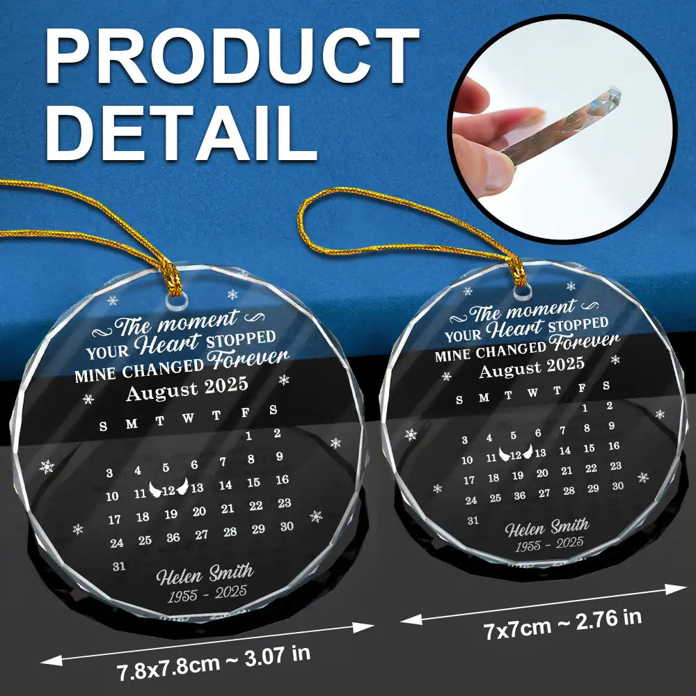 Discover the heartfelt beauty of the Calendar The Moment Your Heart Stopped Memorial - Personalized Circle Glass Ornament. Meticulously crafted from 100% clear glass with beveled edges, this solid glass exudes timeless elegance, catching and reflecting light beautifully to add a radiant touch to your Christmas tree, wreath, or mantel. The ornament’s beveled edges create a stunning prism effect, giving it a sophisticated, multi-dimensional appearance. The smooth, crystal-clear surface is perfect for customizing.
