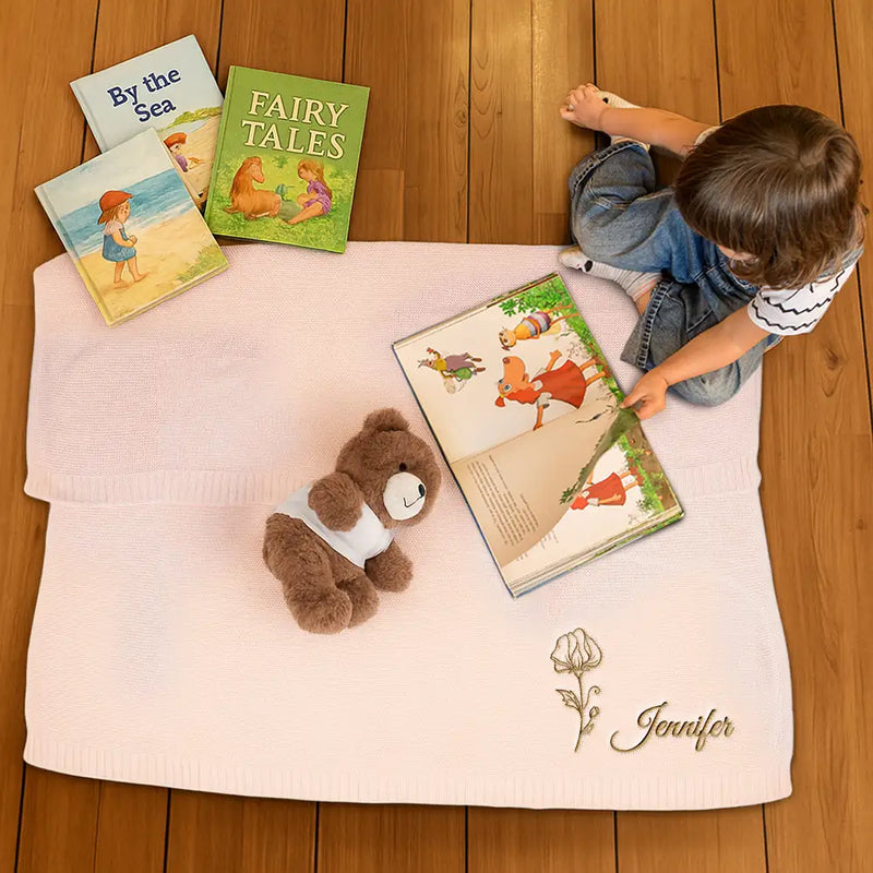 Birth Month Flowers Sketch Baby Name - Personalized Embroidered Knitted Baby Blanket