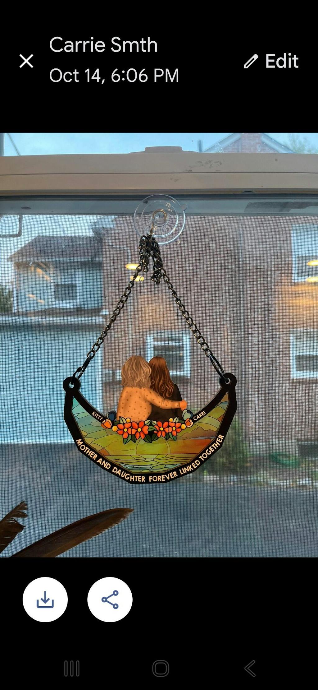 Crafted with care, this suncatcher features a personalized touch with custom names and a design that represents the enduring connection between mother and daughter. Its unique design ensures it catches and reflects sunlight beautifully, creating a lovely rainbow effect that adds charm to any window or room. Ideal for use in a sunny window, as part of a festive display, or even as a decorative piece in a rearview mirror, it brings warmth and light into any space.