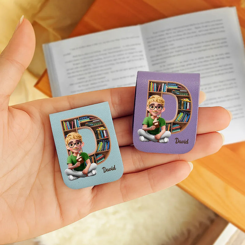 Bookish Monogram Girl With Book - Personalized Leather Magnetic Bookmark