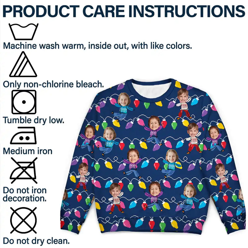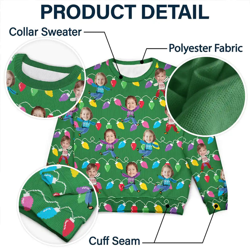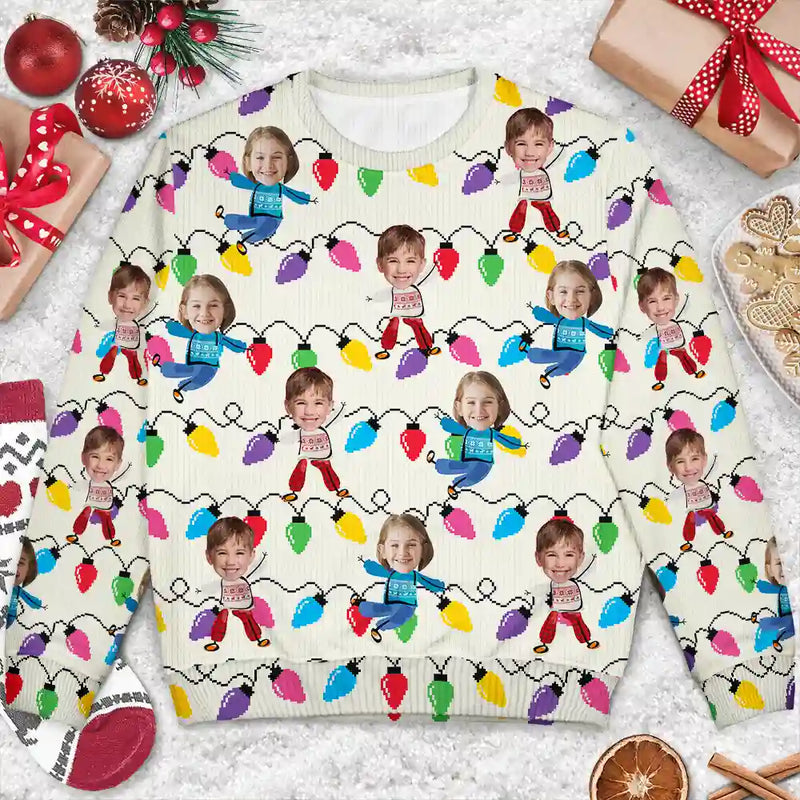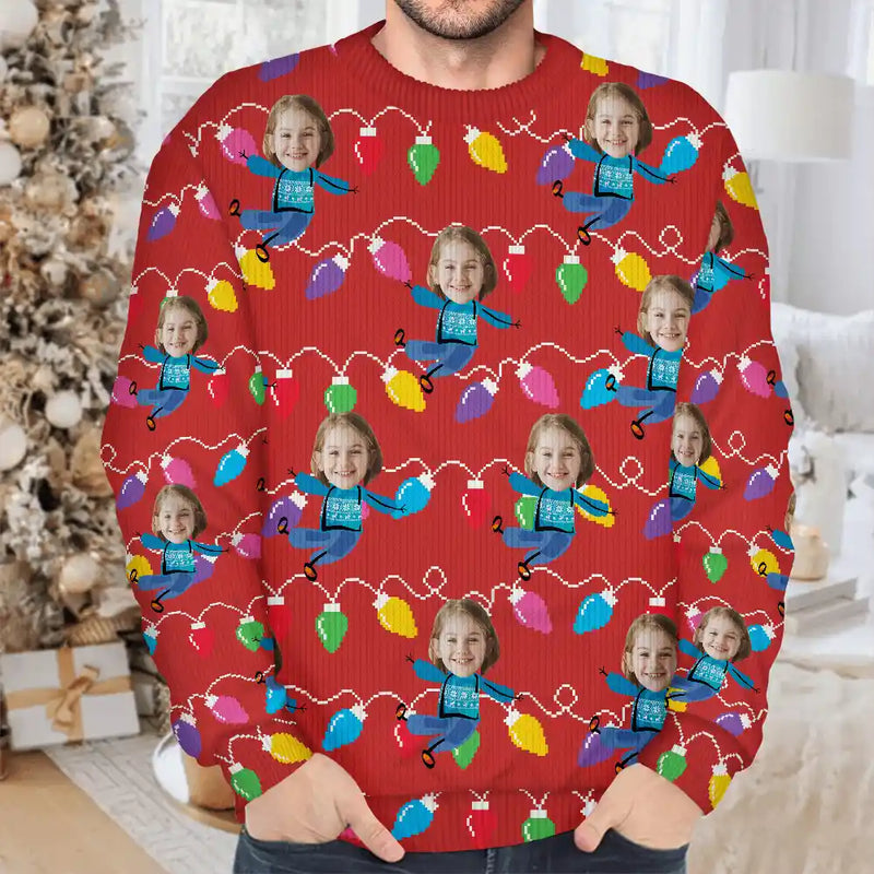 Bring joy and laughter to your holiday season with the Custom Photo Funny Kids Christmas Light - Personalized Unisex Ugly Sweater. This playful and unique sweater makes an unforgettable gift for family, grandparents, parents, grandpa, grandma, father, and mother on Father's Day, Mother's Day, Thanksgiving, Christmas, birthdays, and anniversaries. It's a fun way to celebrate the love and warmth of your family during special occasions.