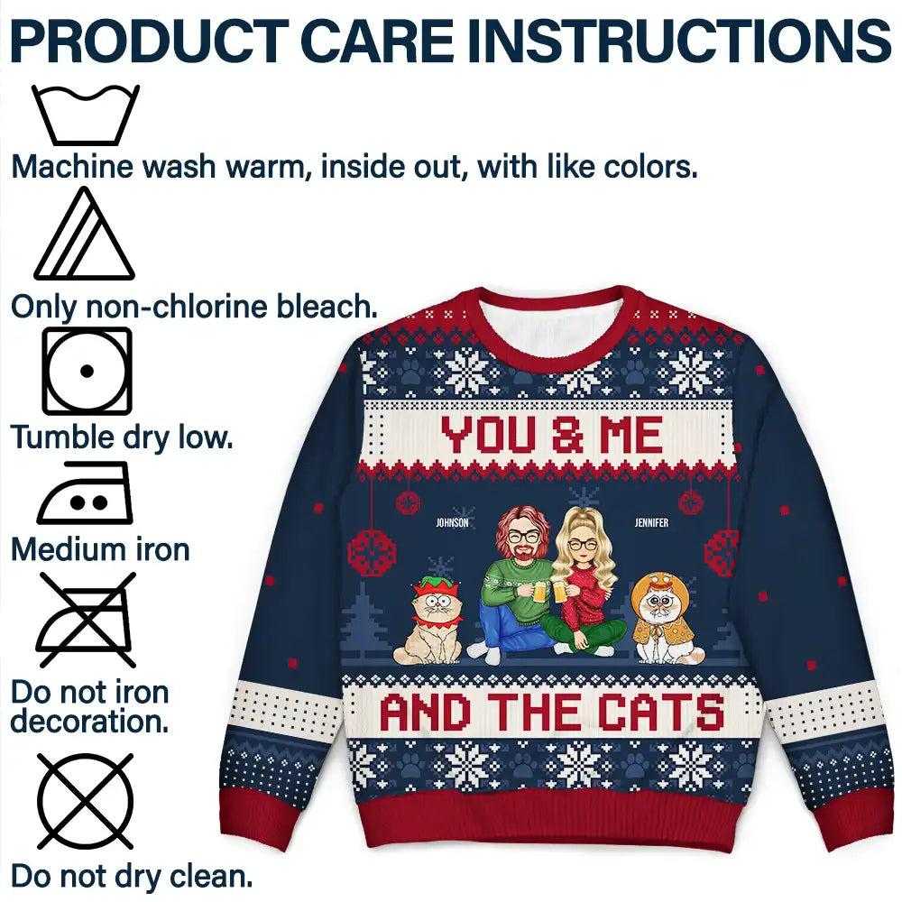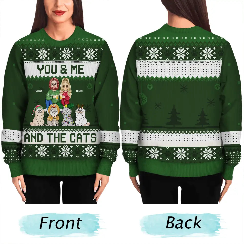 Couple You & Me And The Cats Cartoon Style - Anniversary, Christmas Gift For Cat Lovers, Couples - Personalized Unisex Ugly Sweater