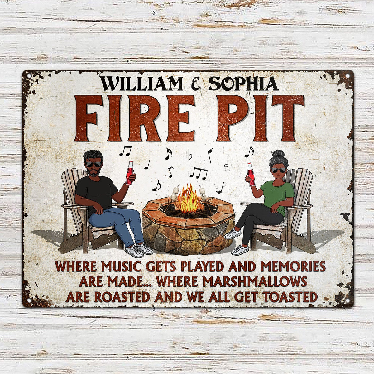 Fire Pit Where Music Gets Played Husband Wife Camping Couple - Backyard Sign - Personalized Custom Classic Metal Signs