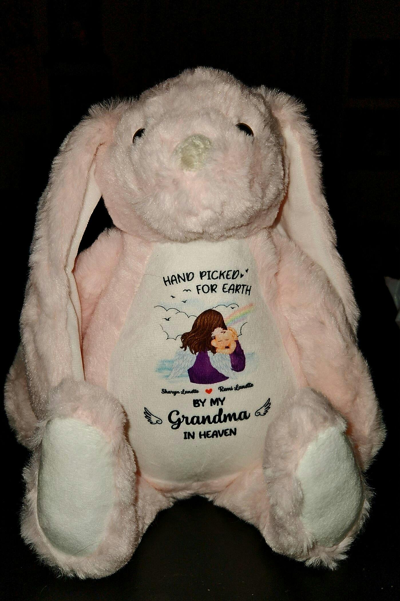 Beautiful little stuffed bunny. Looks exactly like the picture. So glad I got this for my little one. He can always hold his grandma close to him. 💜