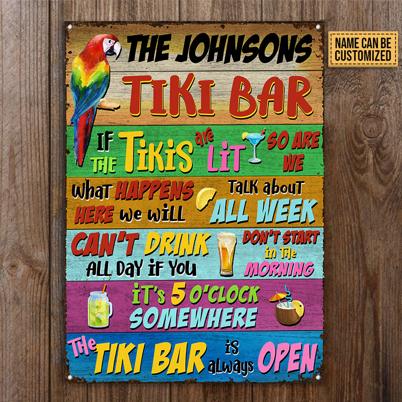 Tropical Parrot Tiki Bar Is Always Open Custom Classic Metal Signs, Tiki Lounge Decor, Parrot Lounge Decor, Tropical Tiki Decor